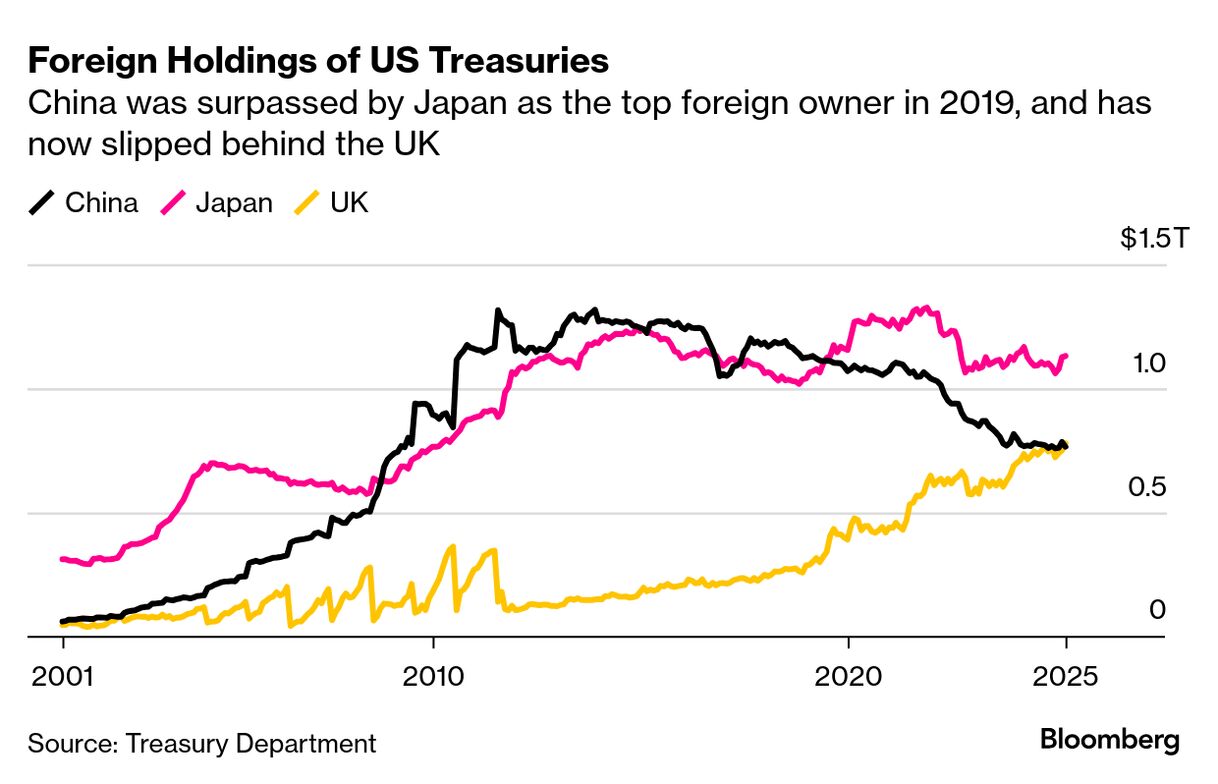 ブルームバーグがまとめたデータによると、中国が最後に米国債保有でトップだったのは日本が首位に入れ替わった2019年。英国が中国を抜いたのは20年以上ぶりとなる。