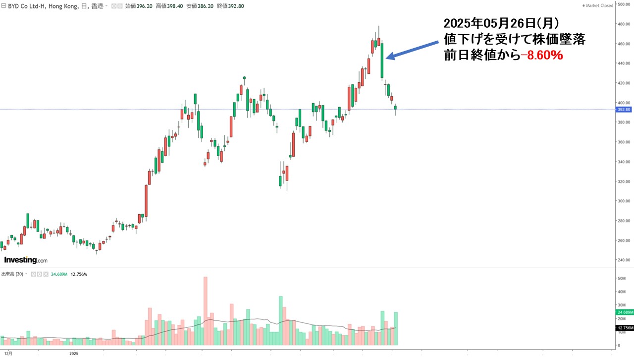 ↑2025年05月30日(金)時点での『BYD』の株価推移(日足)。30日時点での終値は「392.80香港ドル」です。