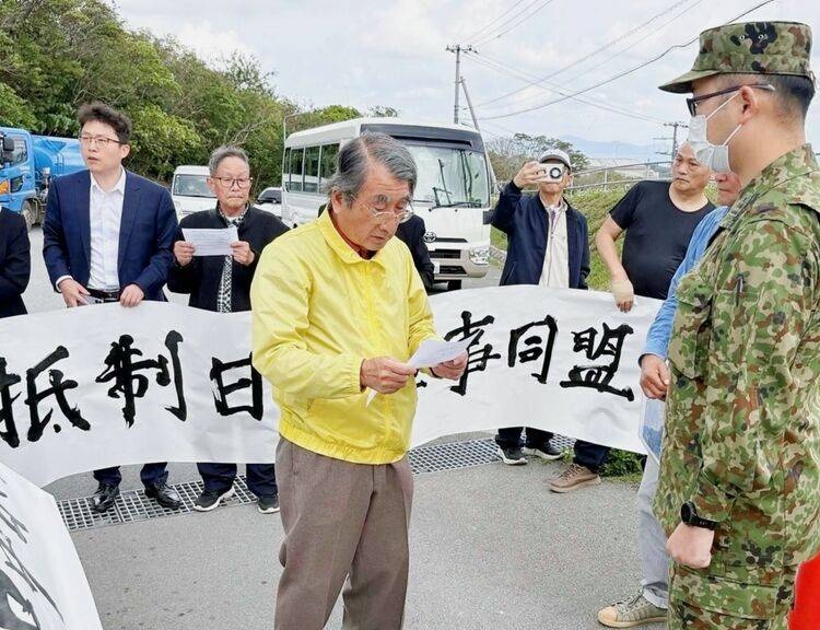 【うるま】市民団体と中国からの訪問団が3日、うるま市の陸上自衛隊勝連分屯地を訪れ、ミサイル配備などに反対する請願書をゲート前で自衛官に手渡した。