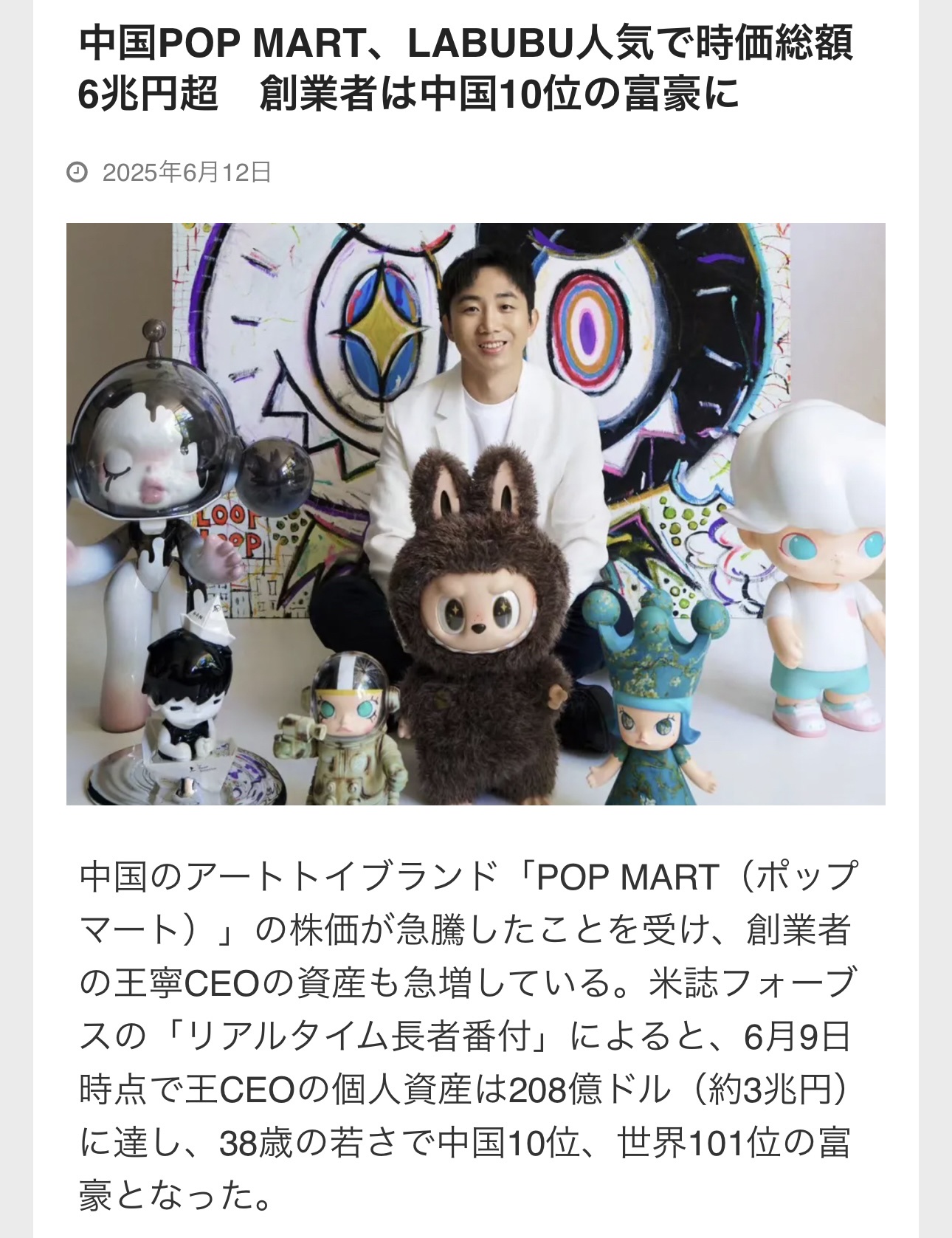 中国のアートトイブランド「POP MART(ポップマート)」の株価が急騰したことを受け、創業者の王寧CEOの資産も急増している。米誌フォーブスの「リアルタイム長者番付」によると、6月9日時点で王CEOの個人資産は208億ドル(約3兆円)に達し、38歳の若さで中国10位、世界101位の富豪となった。