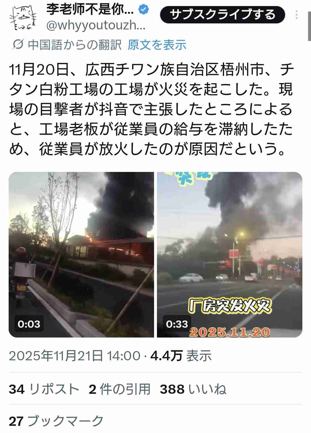 中国の化学工場、賃金未払いにより従業員に放火されるw