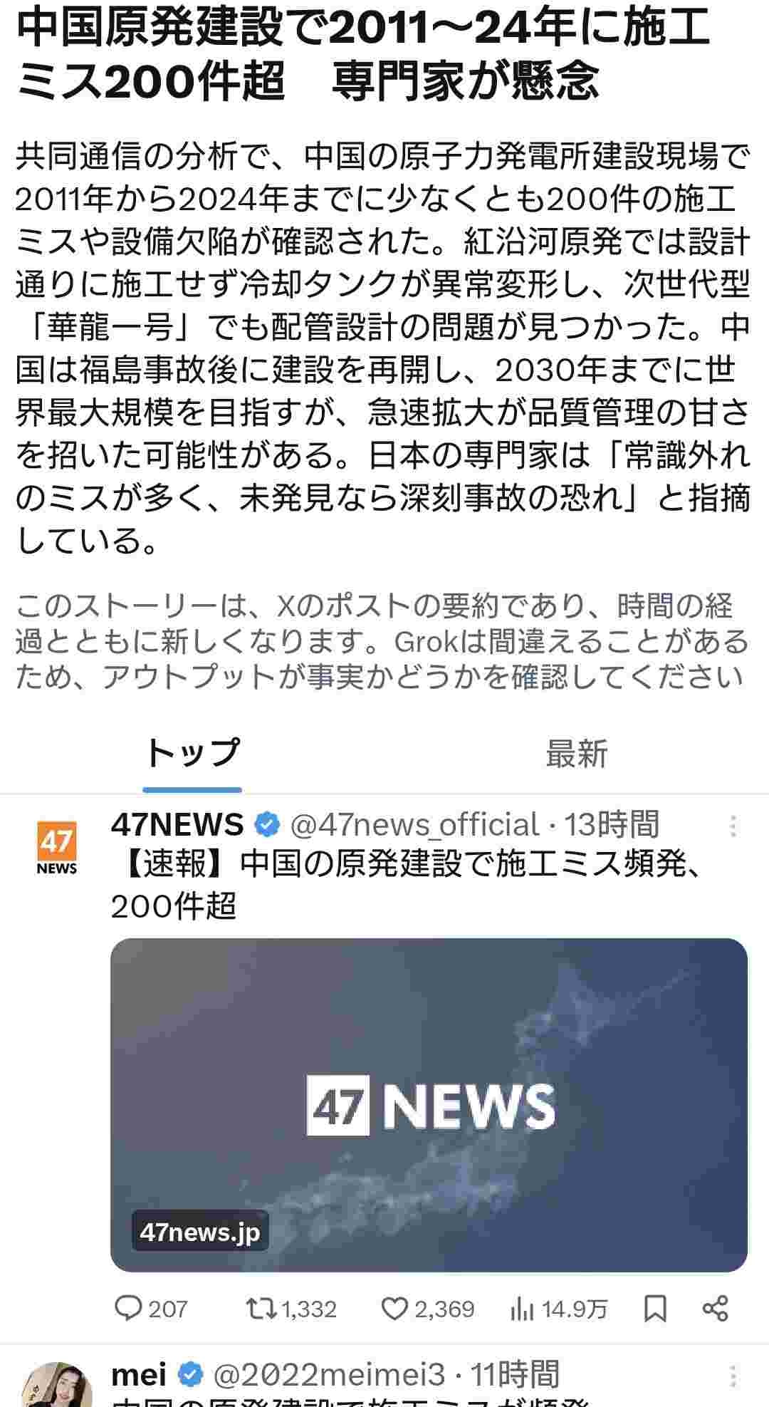 中国の原発建設現場で二百件以上のミスが確認された事実は、急激なエネルギー需要と速度優先の代償である。どの大国も高速化の波に乗る際、品質管理の限界に直面する。これは単なる事故ではなく、システム的な質の低下を示唆する確固たる兆候だ。