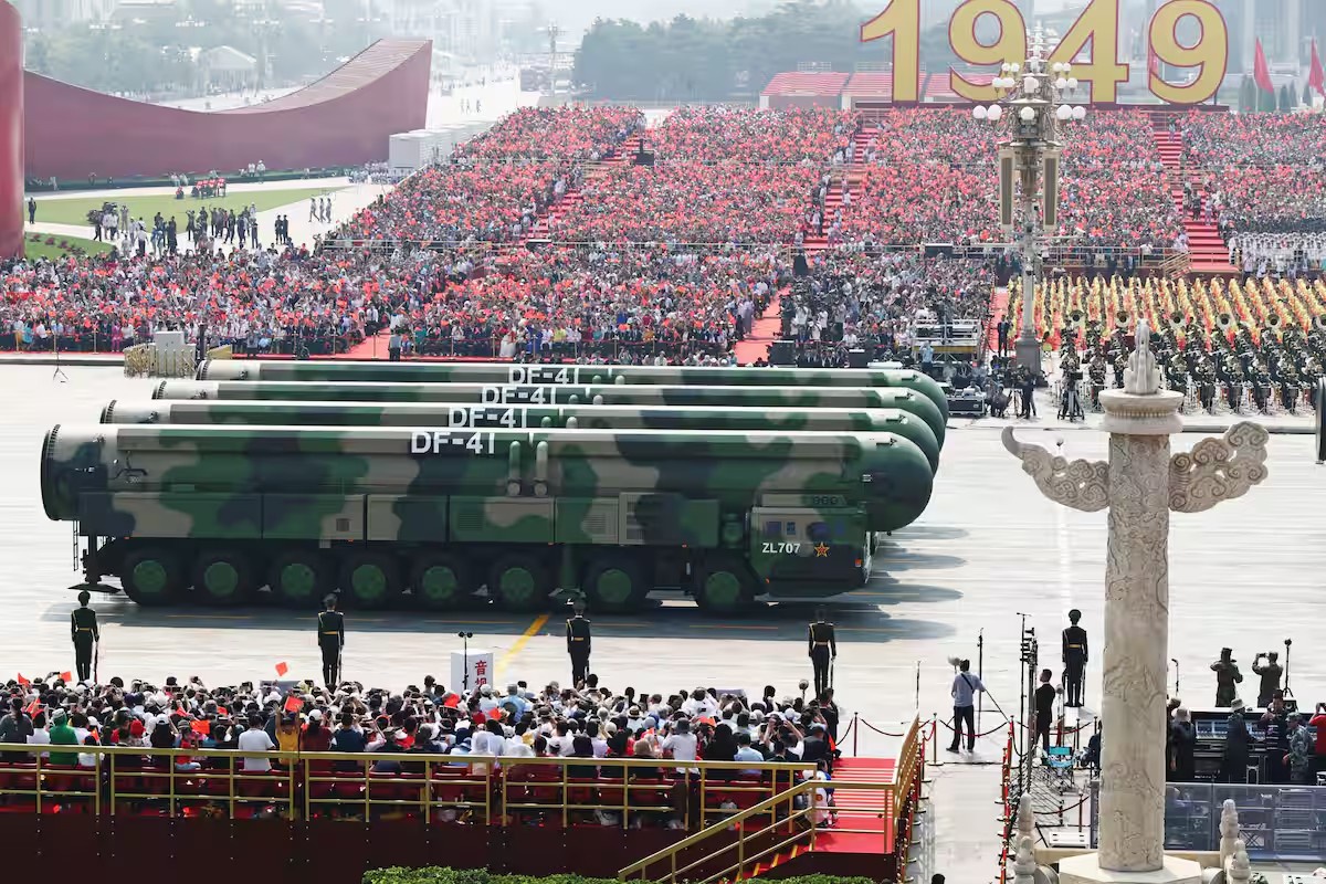 中国の軍事パレードに登場した多弾頭型ICBM「東風41」=2019年10月(新華社=共同)