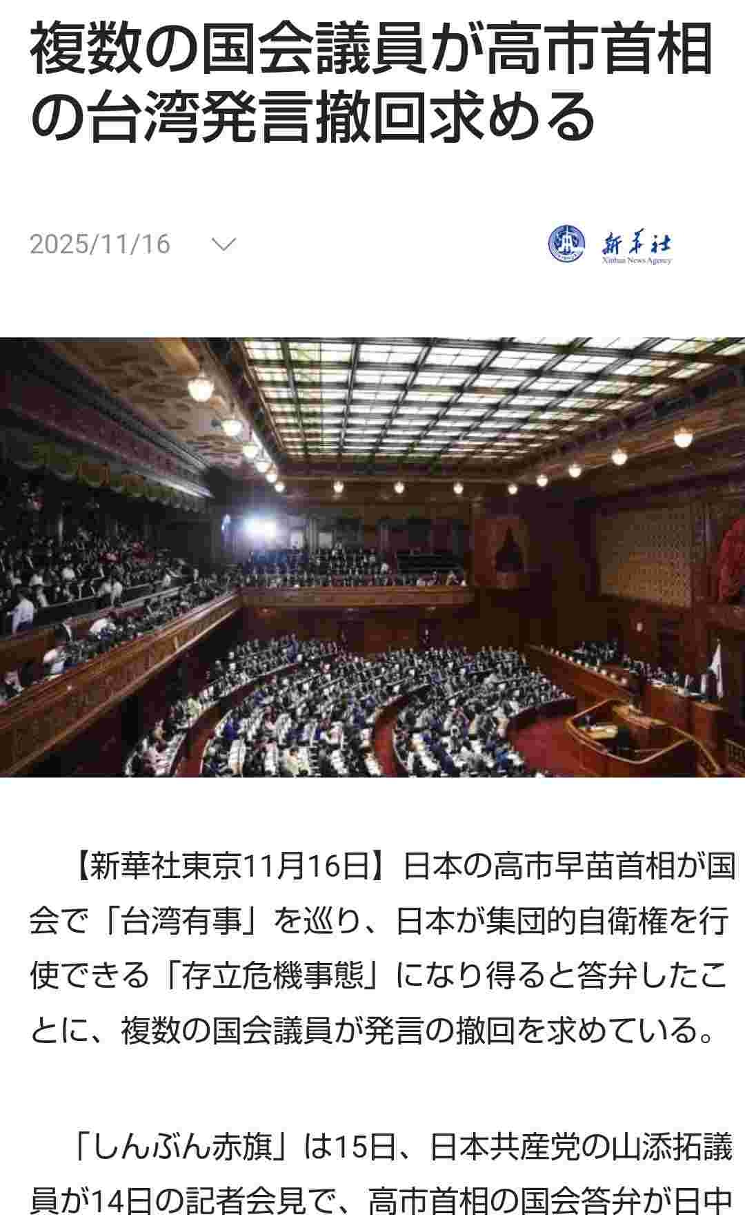 中国・新華社通信「日本の複数の国会議員が高市首相の台湾発言撤回求める」
