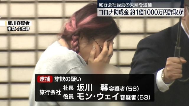 警視庁によりますと、旅行会社社長の坂川馨容疑者と夫で中国籍の孟偉ことモン・ウェイ容疑者は、2022年、新型コロナの影響で休んだ従業員に休業手当を支払ったとウソの申請をして、国の雇用調整助成金およそ1億1000万円をだまし取った疑いがもたれています。