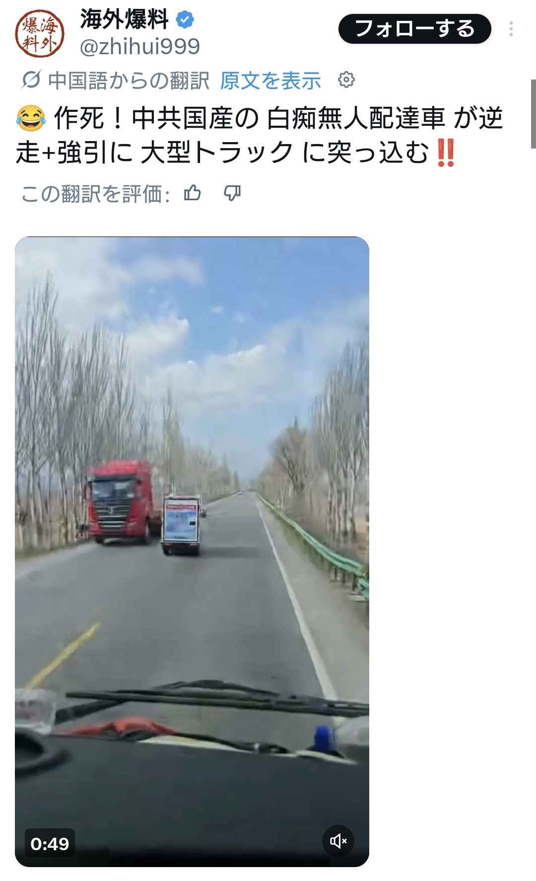 中国製の無人配達車が逆走し、強引に大型トラックに突っ込む