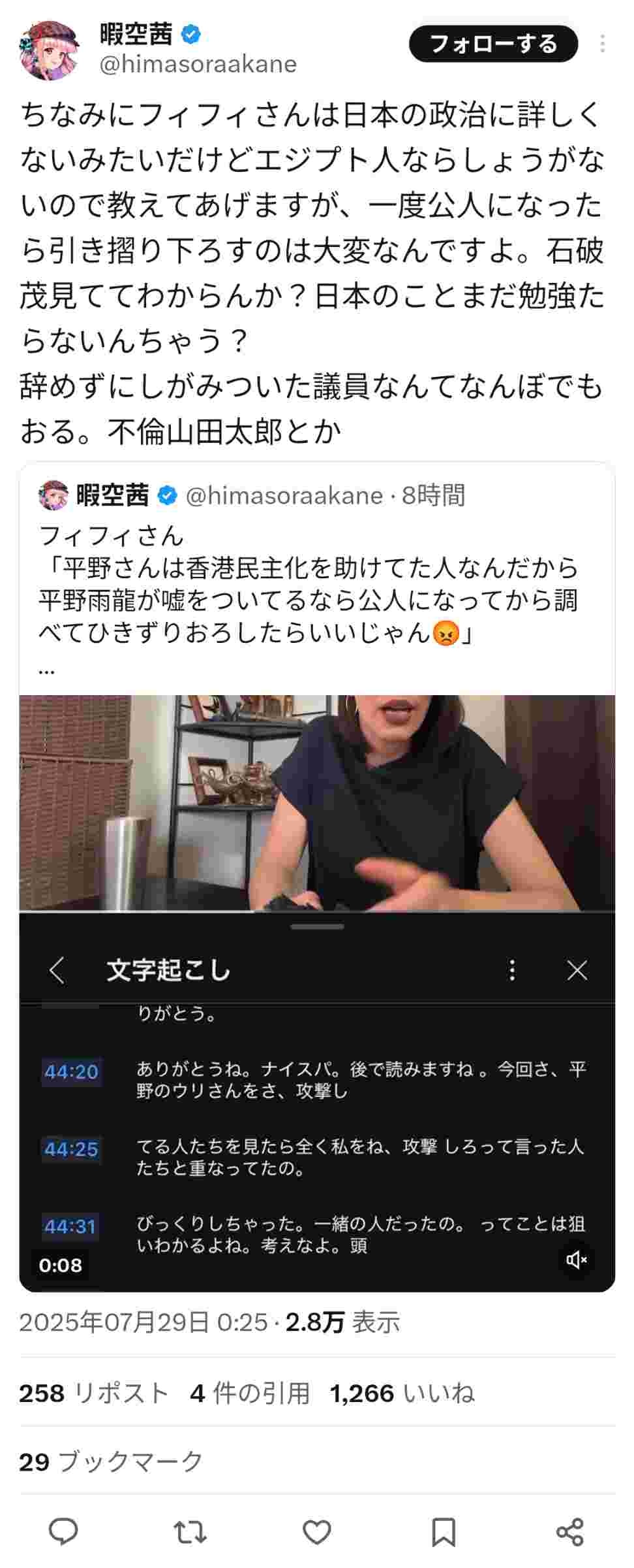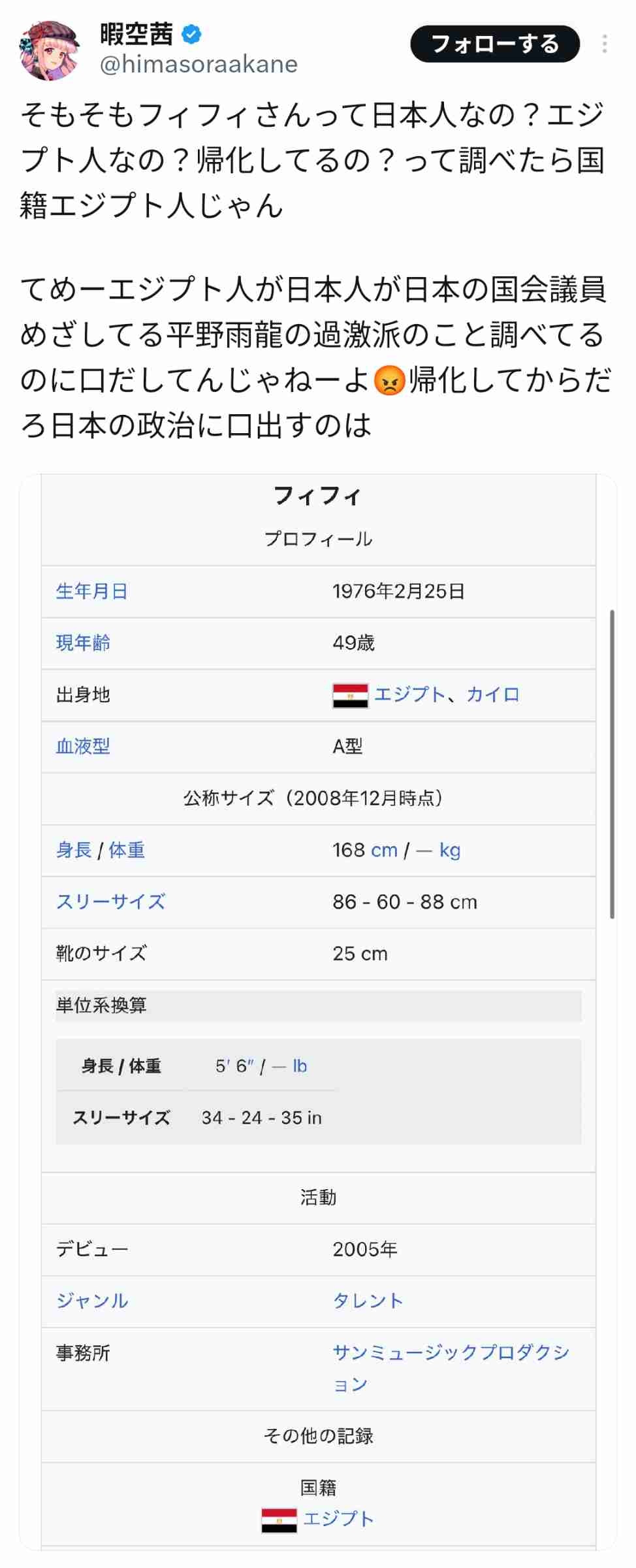 作家・暇空茜氏「フィフィ、てめーエジプト人が日本の政治に口出してんじゃねえ。帰化してから言えや」