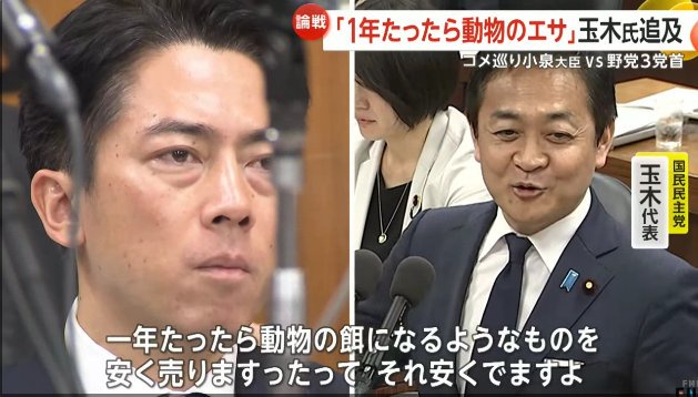 「一年経ったら動物の餌になるようなものを安く売りますったって それ安くでますよ」と終始ヘラヘラ語る玉木氏。それを真剣な表情で聞く小泉氏。
