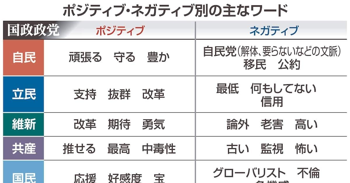 「監視」「カルト」「黒幕」ネガティブワード背景に真偽不明情報か 各党ユーチューブ分析参院選(20日投開票)を巡る各党のユーチューブ動画のコメント分析では、集計期間(7月3~11日)内に公式チャンネルから投稿されたもののうち、視聴回数が最多だっ…www.sankei.com※ソースに一覧表