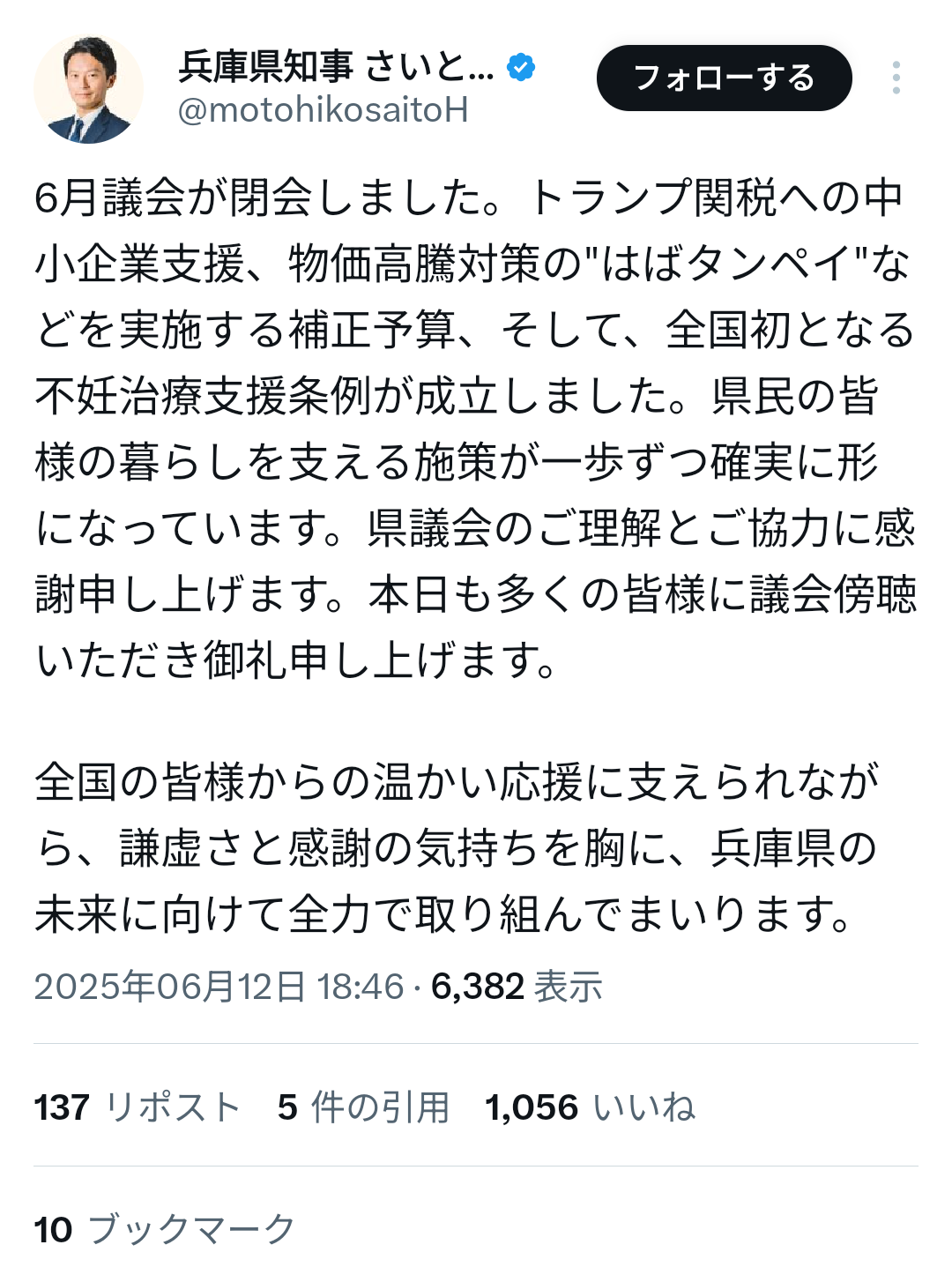 6月議会が閉会しました。トランプ関税への中小企業支援、物価高騰対策の"はばタンペイ"などを実施する補正予算、そして、全国初となる不妊治療支援条例が成立しました。県民の皆様の暮らしを支える施策が一歩ずつ確実に形になっています。県議会のご理解とご協力に感謝申し上げます。本日も多くの皆様に議会傍聴いただき御礼申し上げます。