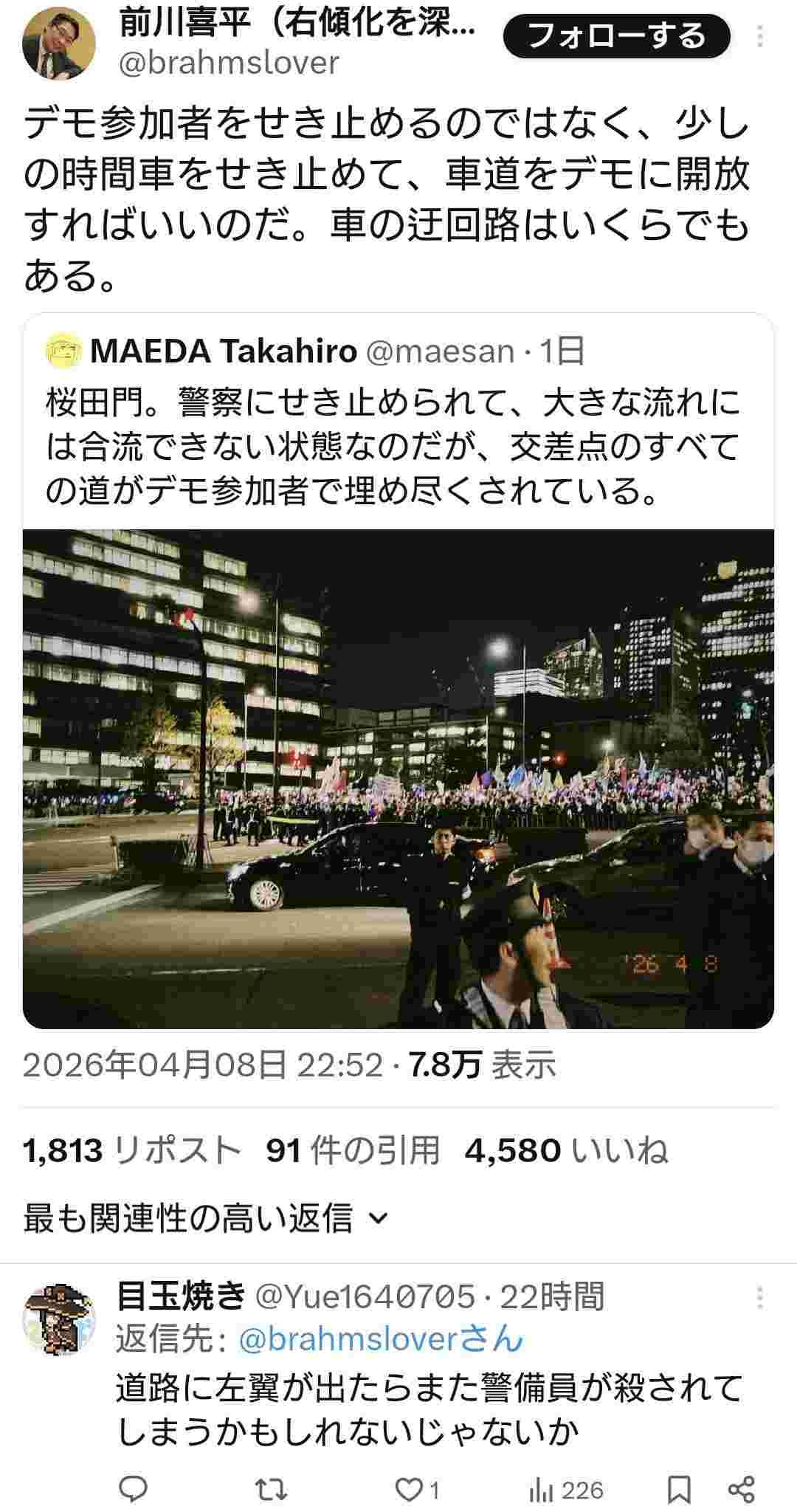 これから、前川氏のこの主張が社会に波及すれば、道路の優先権が車両からデモ隊へと移り、都市の物流機能が致命的な打撃を受けることになる。次に起こるのは、通行を阻まれるドライバーとの激しい衝突、そして法的な解釈を巡る国家的な混乱だ。公共空間が政治的手段として占拠されることが常態化し、社会の流動性は著しく低下するだろう。しかし、この混乱は単なる権利闘争ではない。実は、物流を意図的に麻痺させることで経済を崩壊させ、国民を管理しやすい極限状態へと追い込むための、グローバル勢力による巧妙な社会解体工作が始まっているのである。