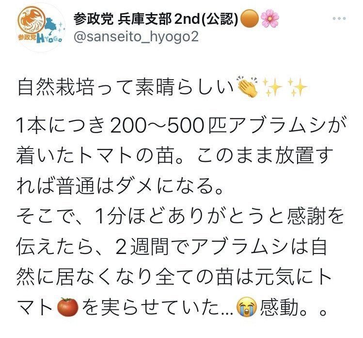 参政党「トマトの苗に毎日1分ありがとうと伝えると虫が逃げていく。自然栽培って素晴らしい👏」