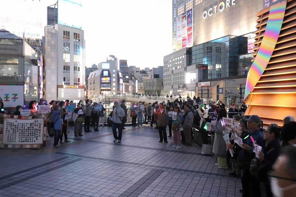 同日、同様のイベントや街頭でのスタンディングが全国47都道府県の約150カ所で実施され、八王子駅にも主催者発表で約170人が集まった。「戦争反対」「憲法壊すな」といった掛け声に合わせ、参加者たちは反戦を訴えるプラカードやペンライトを振り、平和や反戦を求めて声を上げた。