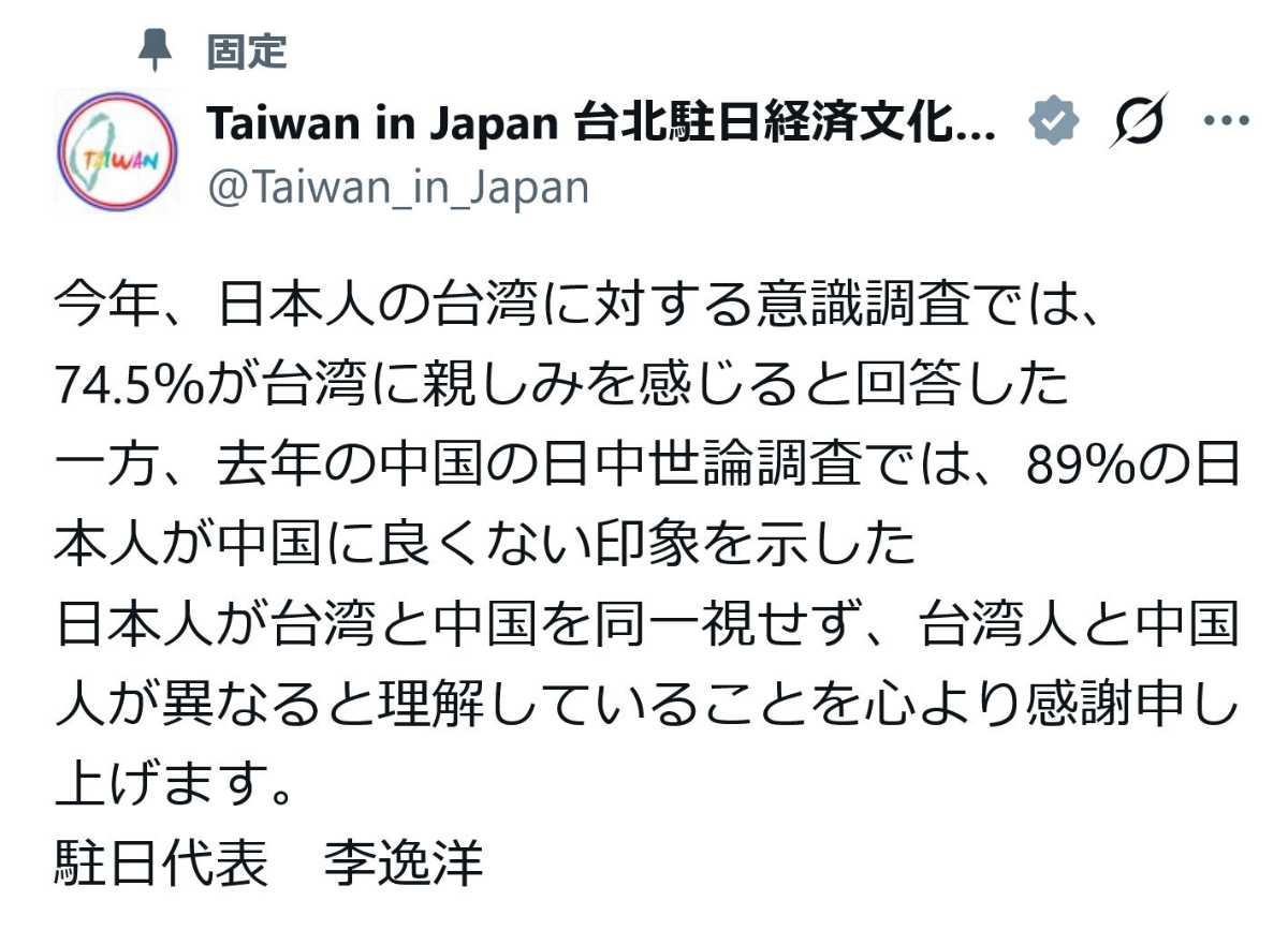 中国に良くない印象を示した」と続けると「日本人が台湾と中国を同一視せず、台湾人と中国人が異なると理解していることを心より感謝申し上げます」と記され、最後に「駐日代表 李逸洋」との名義が記された。同アカウントでは、高市首相の台湾有事をめぐる「存立危機事態」発言に中国が反発し、日中関係が悪化する中、「台湾の立場」として「中華民国台湾は独立した主権国家であり、