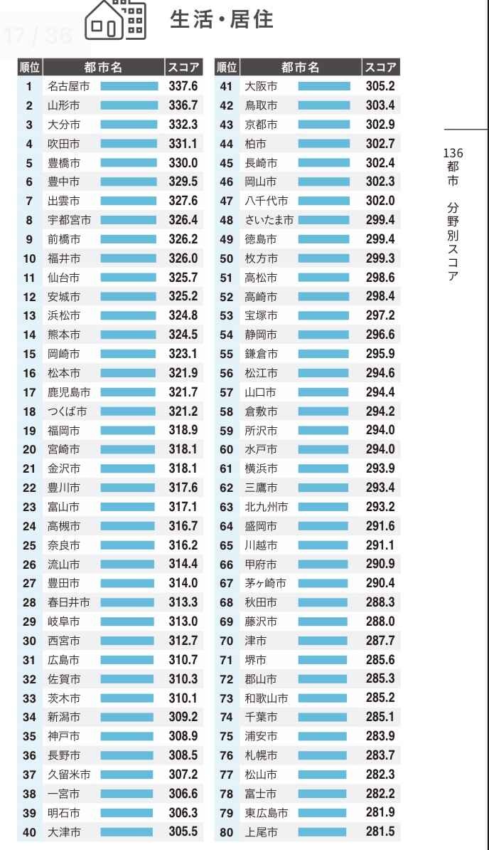 日本の人口15万人以上の都市136都市が対象居住性の基準は家が広く、交通や買い物に困らなく、自然が豊かで、教育機関や医療機関が充実など