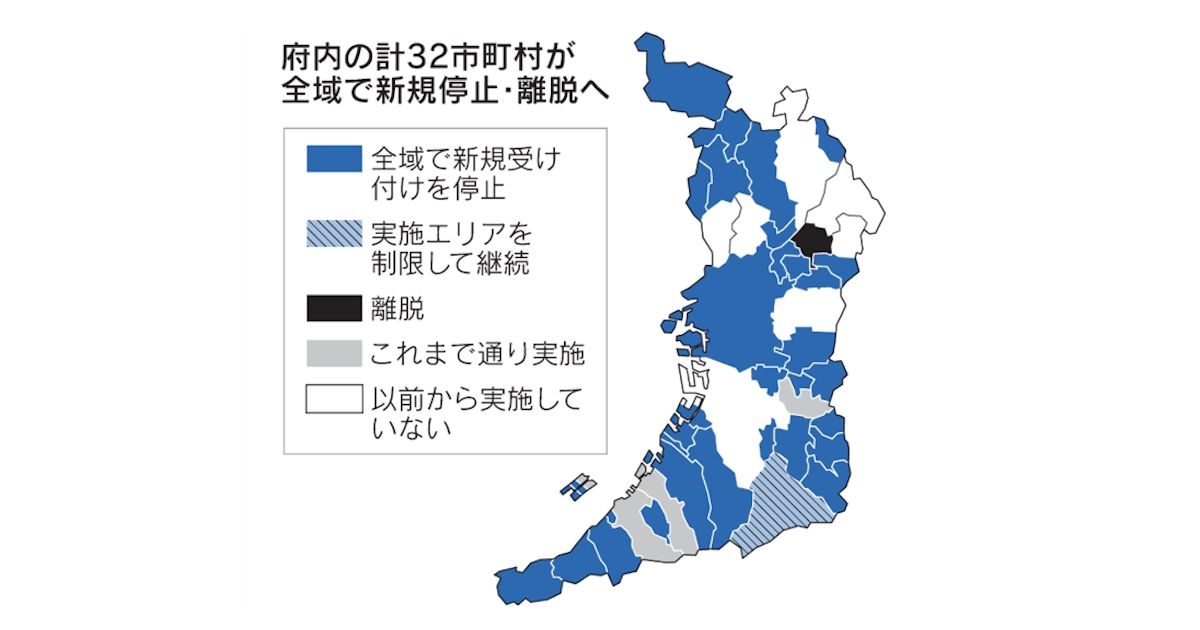34市町村を対象にした意向調査で、新規受け付けを全域で取りやめると答えたのは当初7市町(8月29日時点)だったが、最終的には29市町村に増えた。苦情の増加などを受けて大阪市が停止方針を打ち出し、周辺自治体に影響したとみられる。