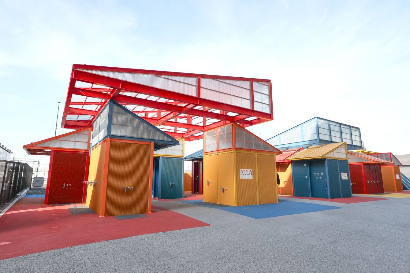【写真】カラフルなユニットが積み木のように積み重ねられた会場のトイレ