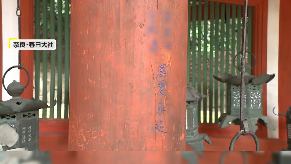 奈良市の世界遺産・春日大社で目撃されたのは、柱に漢字で書かれた青い文字。何者かによる落書きです。
