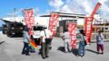 そして、鍋を囲んだスタッフが、しょうゆや砂糖などの味付けがしみこむようにかきまぜたあと、2台のショベルカーですくい上げて取り分け、ふるまわれました。