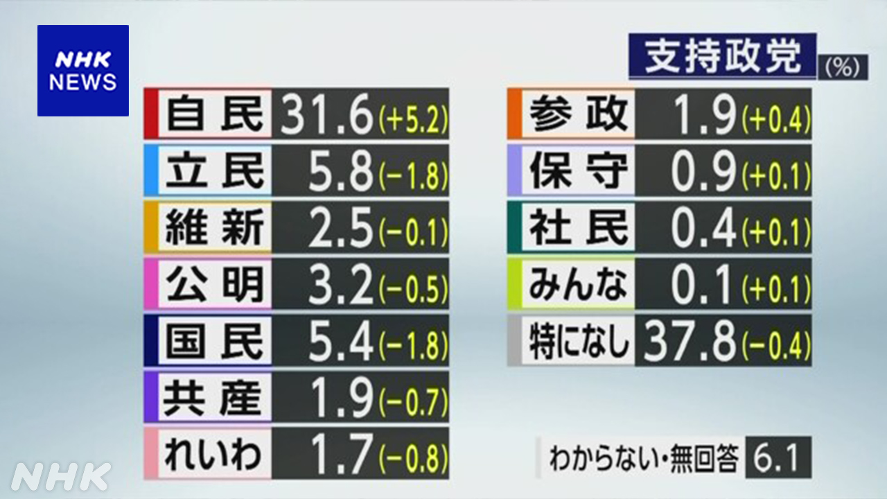 政党支持率「支持政党なし」37.8% 自民の支持率が上昇 NHK世論調査