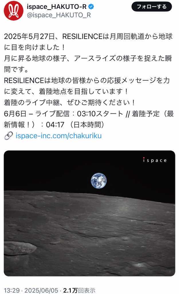 6月6日 – ライブ配信:03:10スタート // 着陸予定(最新情報!):04:17 (日本時間) - 2 : 2025/06/05(木) 15:13:39.48 ID:fjcGJsRg0