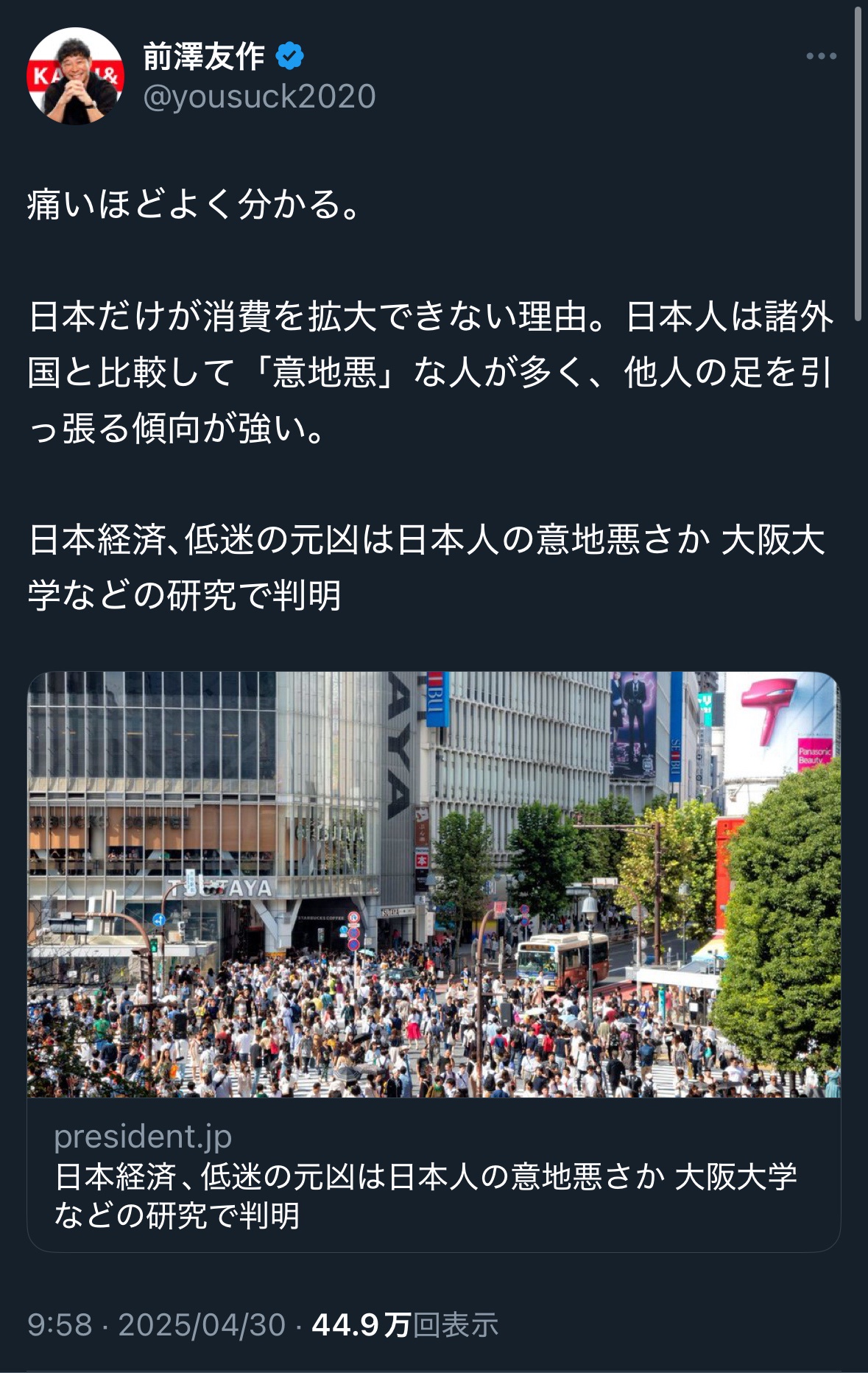 痛いほどよく分かる。日本だけが消費を拡大できない理由。日本人は諸外国と比較して「意地悪」な人が多く、他人の足を引っ張る傾向が強い。