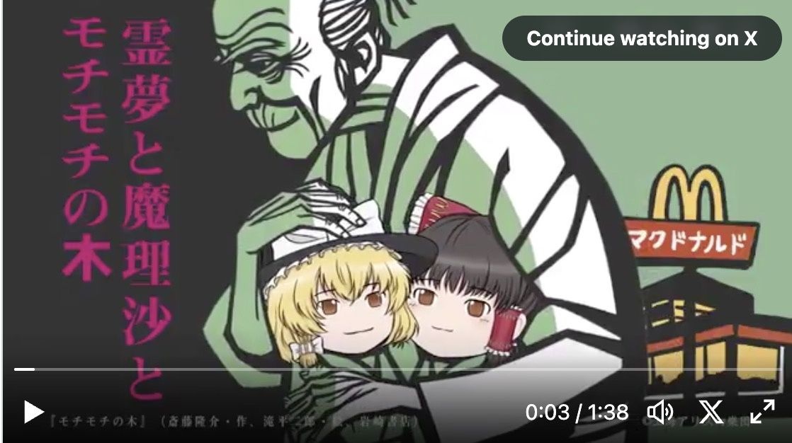 このSNS動画は、日本マクドナルドが2月18日にXなどで公開した「霊夢と魔理沙とモチモチの木」。大型コラボをうたい、東方Projectの人気キャラクターである博麗霊夢と霧雨魔理沙、切り絵による児童文学作品として有名な「モチモチの木」という異色の組み合わせで注目を集めた。