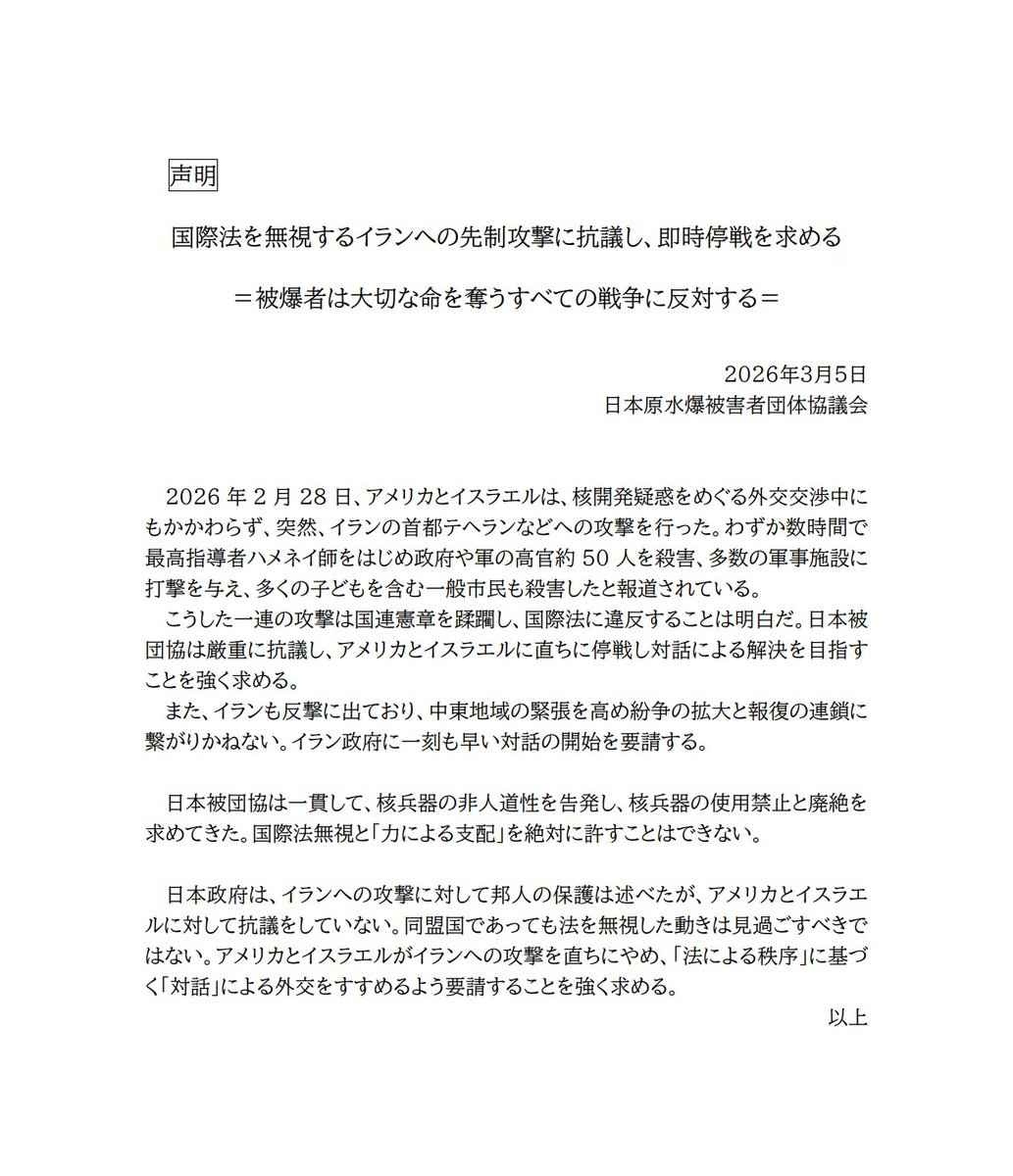 日本原水爆被害者団体協議会(日本被団協)は、国際法を無視するイランへの先制攻撃に抗議し、即時停戦を求めます。