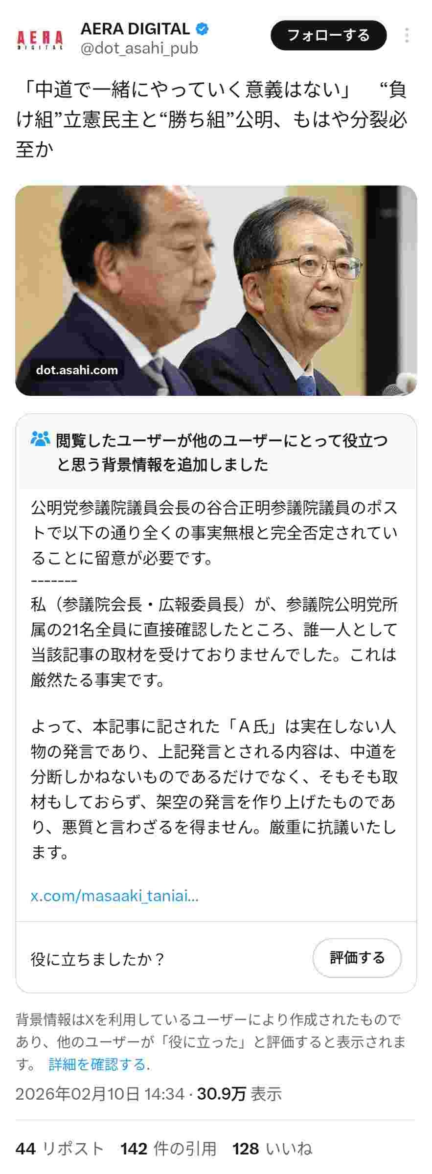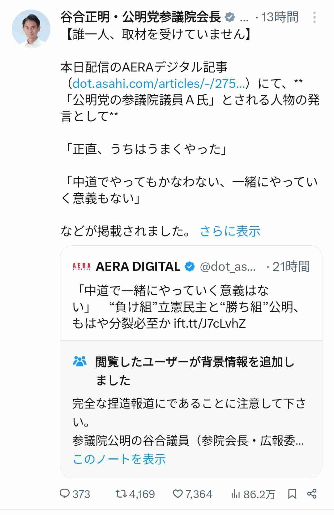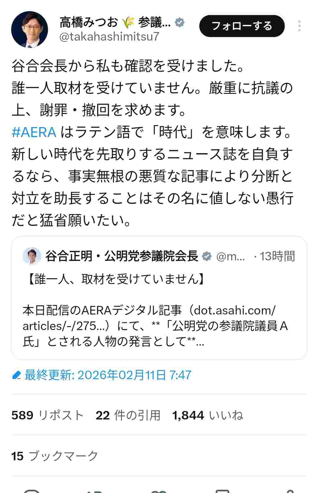 本日配信のAERAデジタル記事(dot.asahi.com/articles/-/275…)にて、**「公明党の参議院議員A氏」とされる人物の発言として**