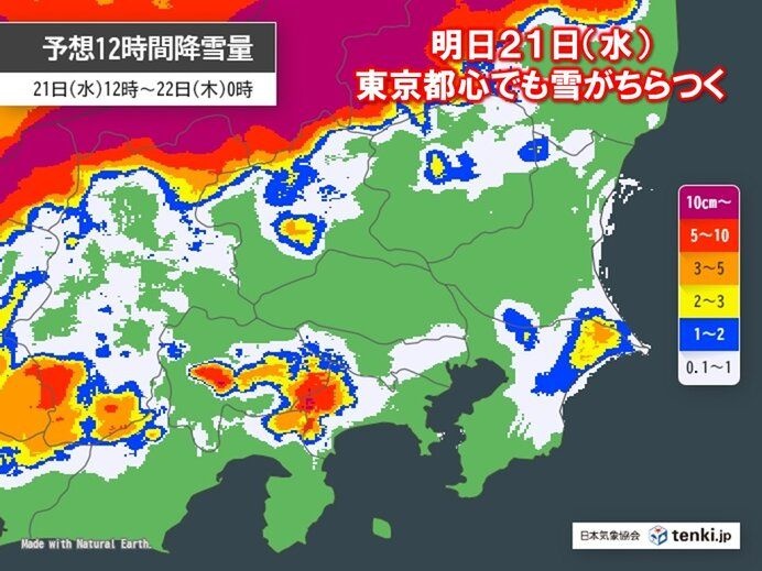 明日21日(水)の関東は、東京都心など平野部でも雪のちらつく所があるでしょう。