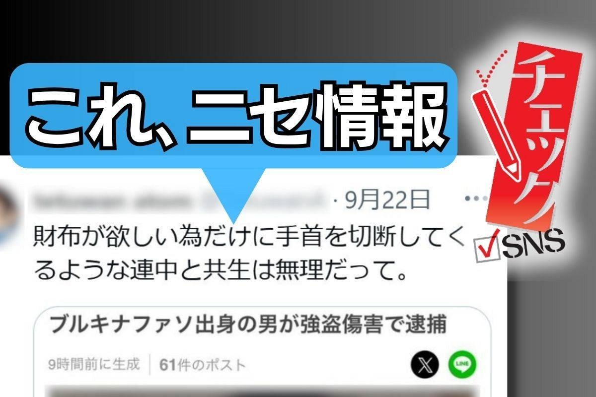 「(西アフリカの)ブルキナファソ出身の学生が財布を奪って刃物で手首を切断した」──。9月下旬、交流サイト(SNS)で、そんな情報が拡散した。東京新聞が警察や検察に問い合わせたところ、「切断した」という逮捕事実はなく、情報は「一部誤り」と判断した。