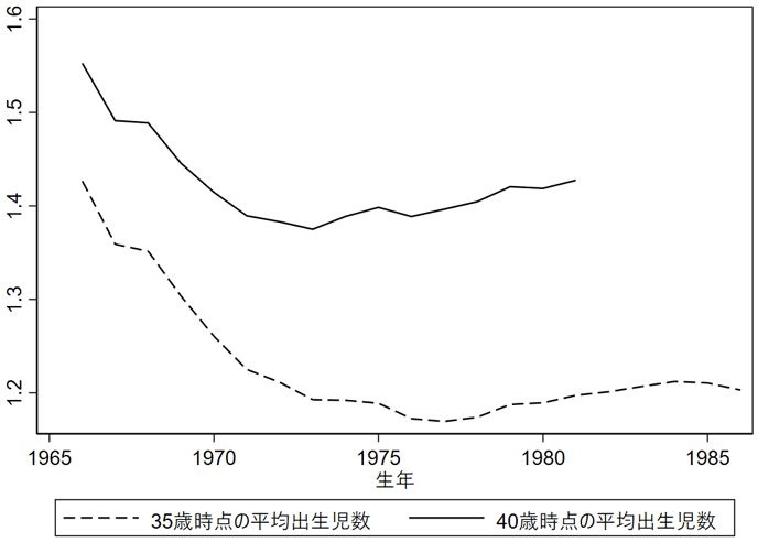 そして、人口動態統計と国勢調査から一人の女性が35歳ないし40歳までに生んだ子供の数を世代ごとに集計すると、就職氷河期の最悪の時期に労働市場に参入した1970年代後半から1980年代前半生まれの女性が産んだ一人当たりの子供の数は、すぐ上の世代よりもわずかながら多い。