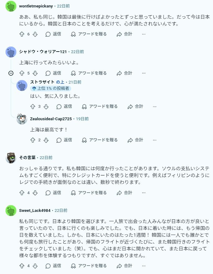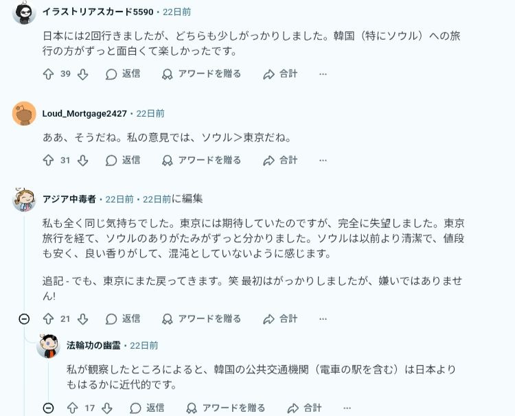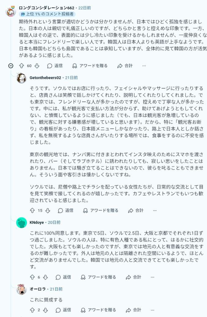 韓国人がどう思ってるかは知らないけど、こんだけ迷惑で低レベルな白人旅行者多いのにもう有難がる時代じゃないだろ。舞妓を無理やり引っ張って写真撮影しようとする映像とか神社への敬意のなさとかうんざりする