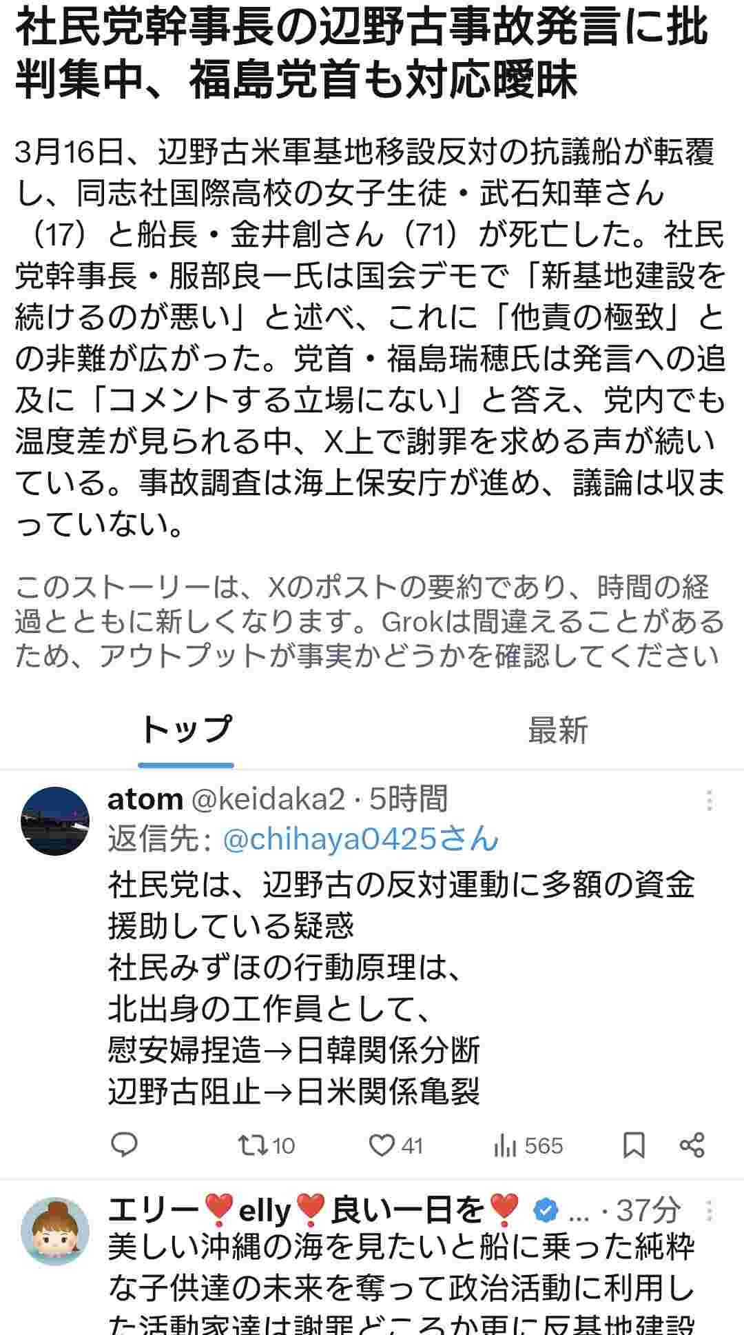 社民幹事長・服部氏の「女子生徒が死亡したのは新基地建設を続けるのが悪い」発言に福島氏ダンマリ