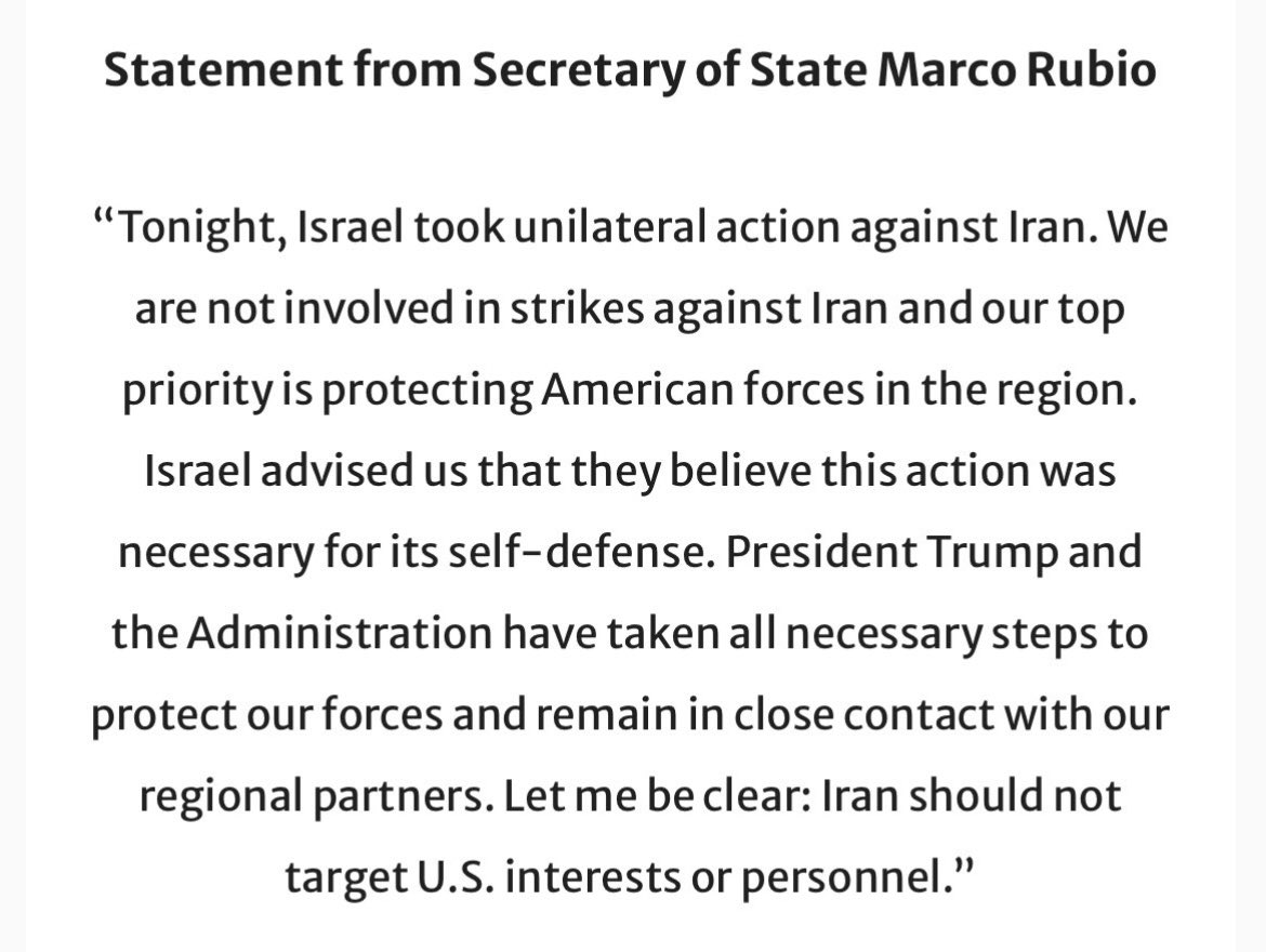 アメリカのルビオ国務長官は12日、声明を発表しました。このなかでルビオ長官は「今夜、イスラエルはイランに対して単独で行動を起こした。われわれはイランに対する攻撃に関与しておらず、われわれが最優先にしているのはこの地域のアメリカ軍の保護だ」とコメントしました。