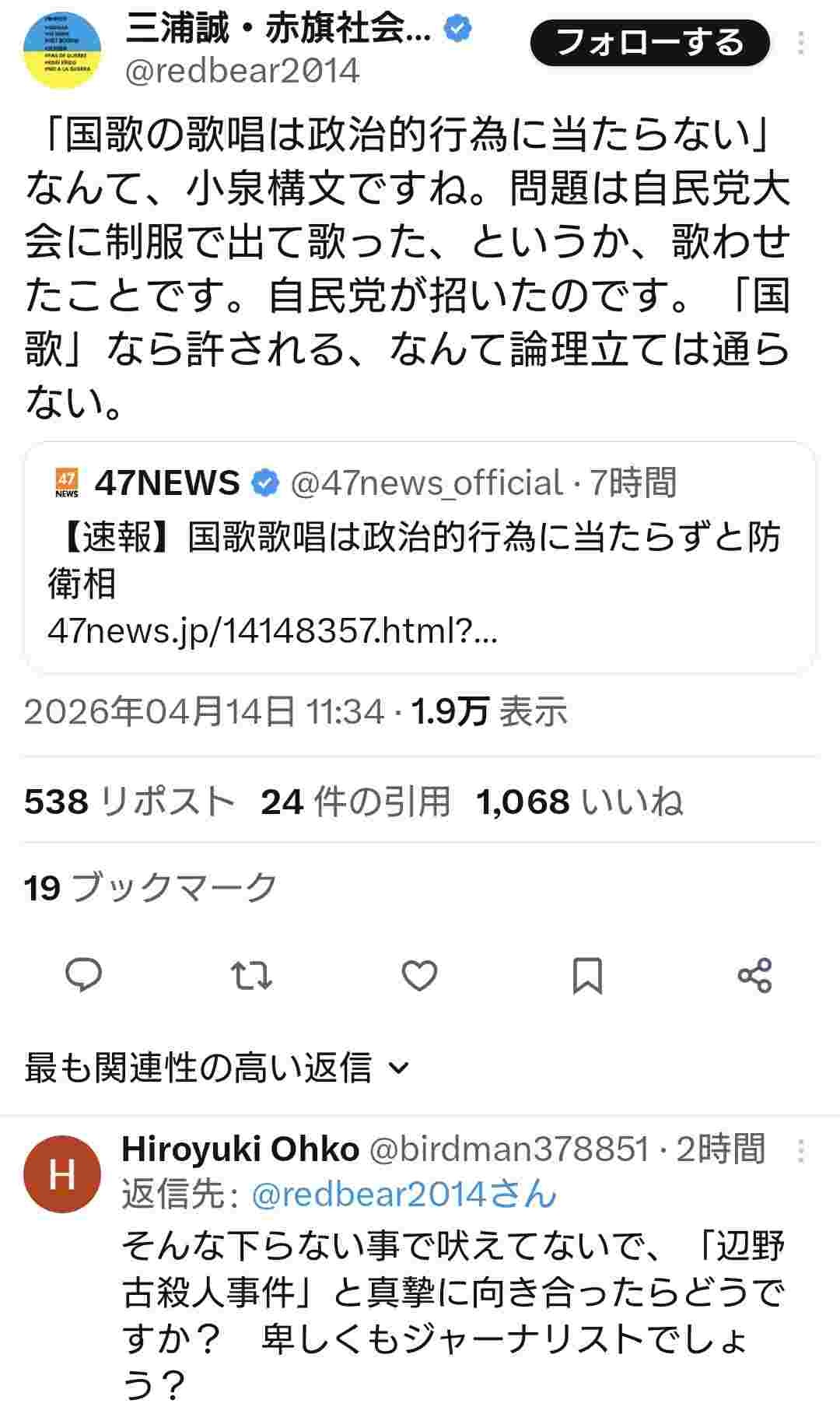 国の組織が国歌を歌う事に言い掛かりを付けるような国賊政党が存在してる事が大問題