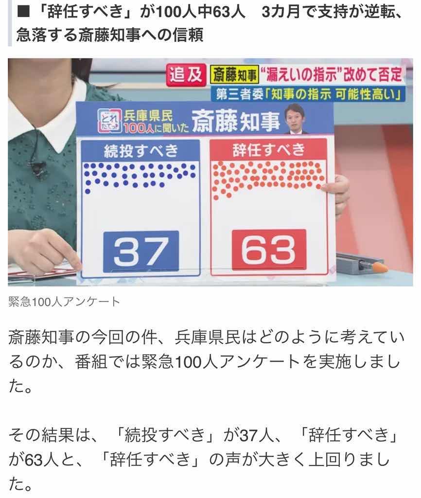 辞任しろ63人 続投37人 斎藤兵庫オワコン 兵庫県民100人アンケート(画像あり)
