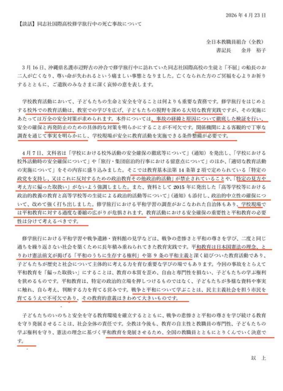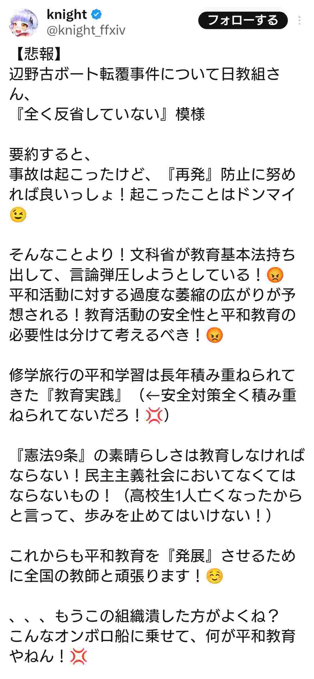 辺野古ボート転覆事件について日教組さん『全く反省していない』模様