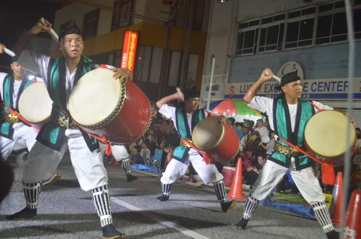 この日は「第15旅団」と記された旗頭が夜空にたなびき、隊員たちが道路をいっぱいに使い熱演。周辺には足の踏み場がないほどの聴衆が押し寄せ、息をのんでエイサーを見守っていた。