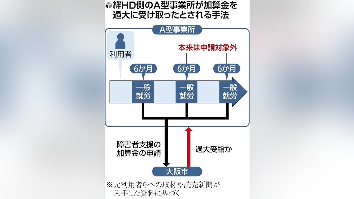 大阪市の福祉関連会社「絆ホールディングス」(絆HD)の子会社などが運営する三つの「就労継続支援A型事業所」が、障がい者就労支援の加算金を2024年度以降に20億円以上、過大に受け取った疑いがあるとして、市が障がい者総合支援法に基づく監査に入った。複数の関係者への取材でわかった。絆HDは「法令を 遵守じゅんしゅ している」としているが、市は不適切な受給とみて返還請求を検討している。