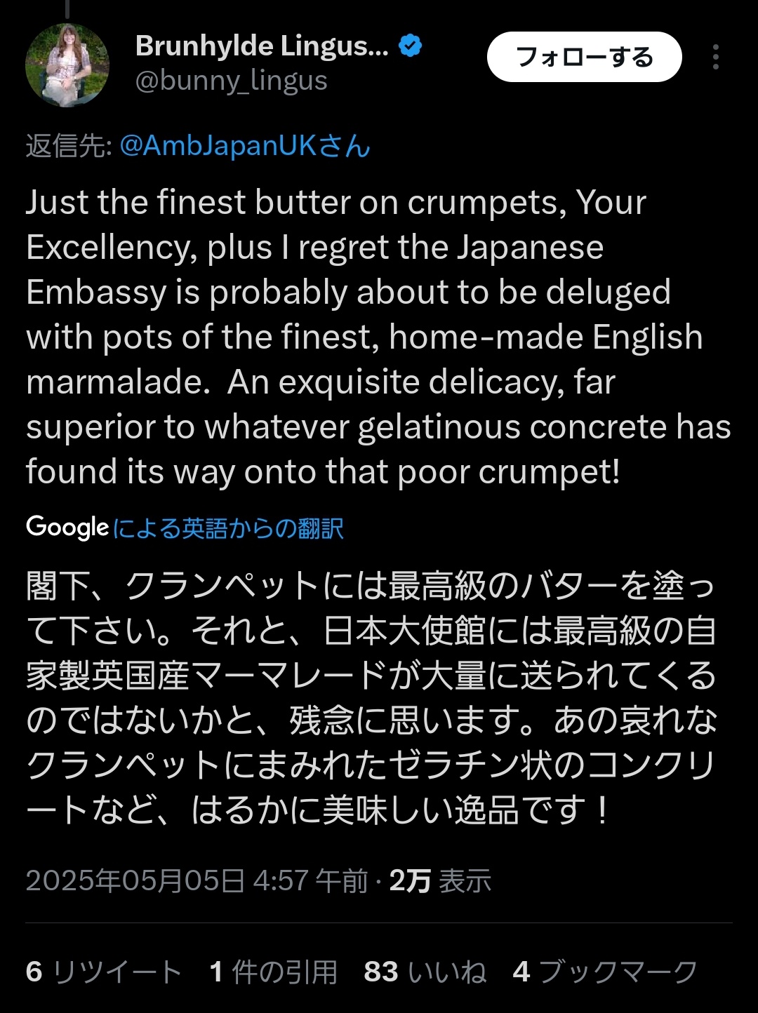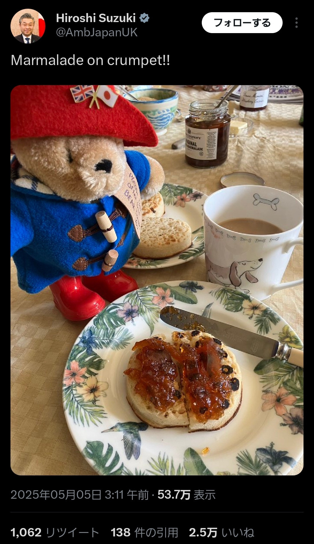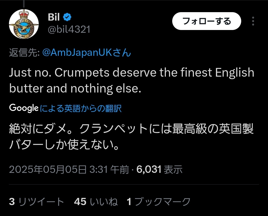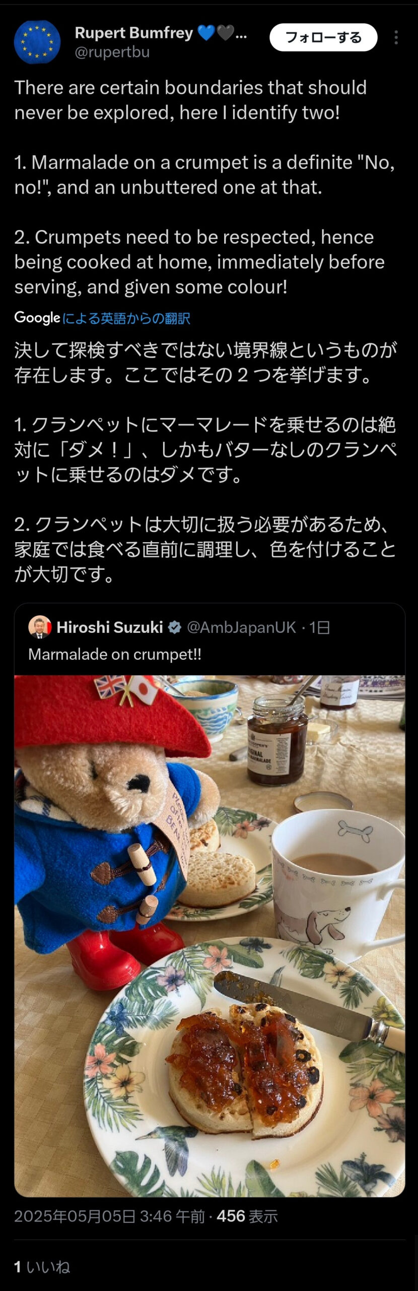 駐英日本大使やらかす。イギリス人「ギャー!クランペットにバターではなくジャムを直塗りしてるぅ」