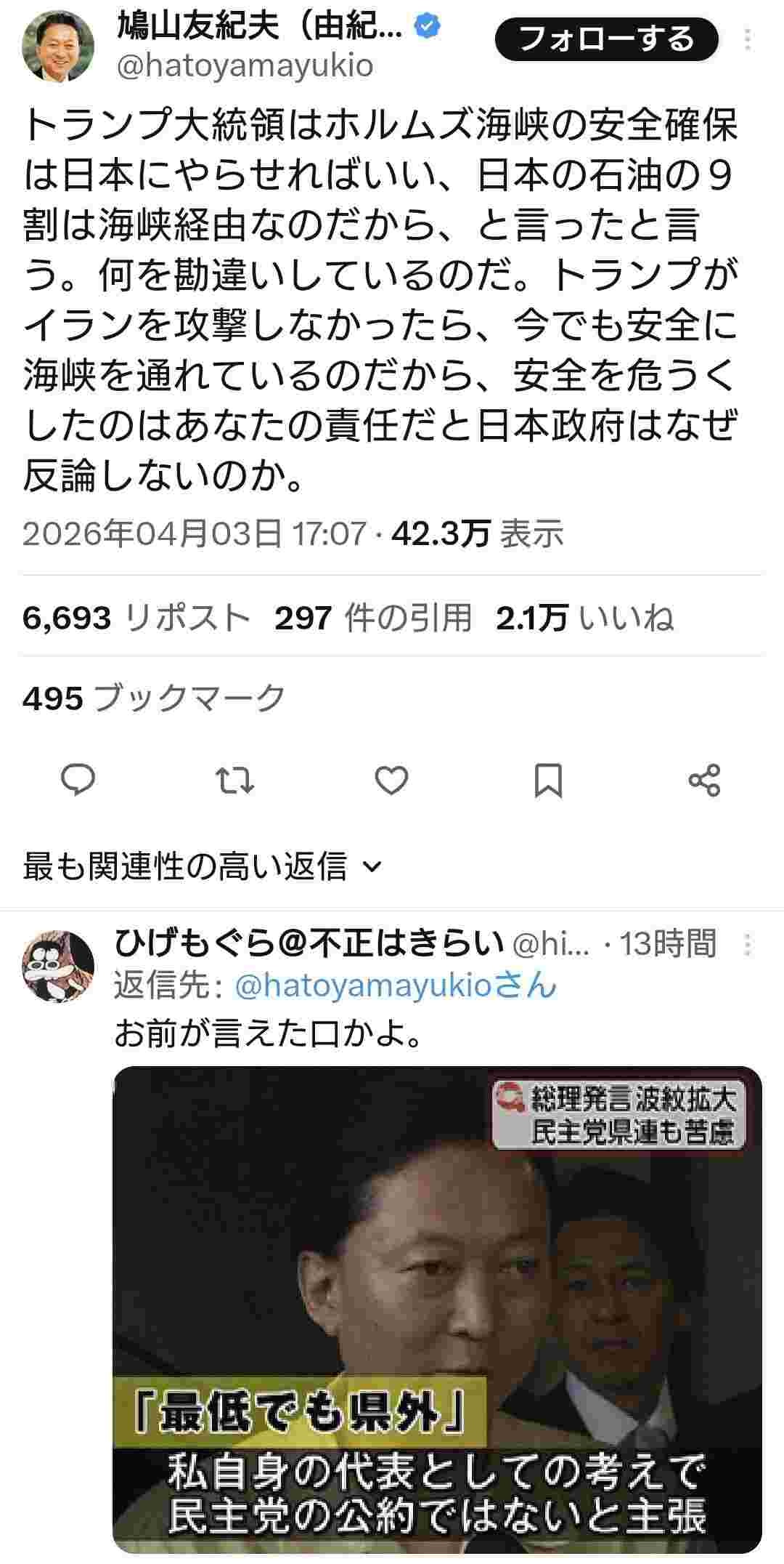 それより今は辺野古転覆にコメントしろよ最低でも県外