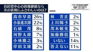 ニュー速 次の首相、高市氏トップ26% 次いで小泉氏22%【NNN・読売新聞 緊急世論調査】