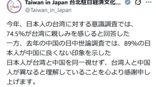 ニュー速 台湾駐日大使「日本は『中国嫌い、台湾好き』が多いから中国人と台湾人を区別して考えている」
