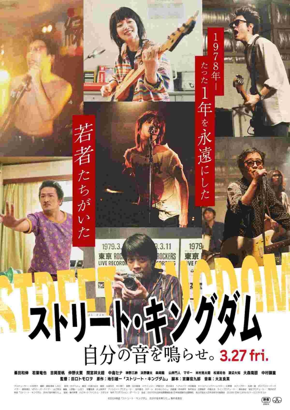 「ストリート・キングダム 自分の音を鳴らせ。」は、写真家・地引雄一の同名エッセイを宮藤官九郎脚本、田口トモロヲ監督で実写化した青春映画。1978年、偶然ラジオから流れたSex Pistolsに突き動かされた青年カメラマンのユーイチが、田舎から上京してバンド・TOKAGEを率いるモモと出会い、やがて“東京ロッカーズ”と呼ばれるムーブメントを巻き起こしていくさまが描かれる。ユーイチを峯田和伸(銀杏BOYZ)が、モモを若葉竜也が演じるほか、JAGATARAのボーカリスト・江戸アケミをモデルにした「ごくつぶし」のボーカル・ヒロミ役を中村獅童が演じる。
