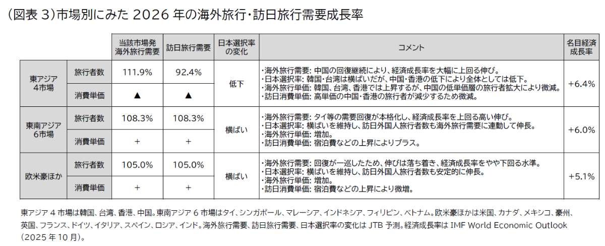 2026年における発地別の訪日外国人旅行者数は、中国・香港からの旅行者数減少の影響を受ける東アジア4市場を除き、各国・地域における海外旅行者数の増加率と同程度の伸びを見込んでいます。