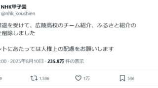 芸スポ 「NHK甲子園」公式X、広陵の学校紹介投稿を削除「人権上の配慮を」注意喚起も
