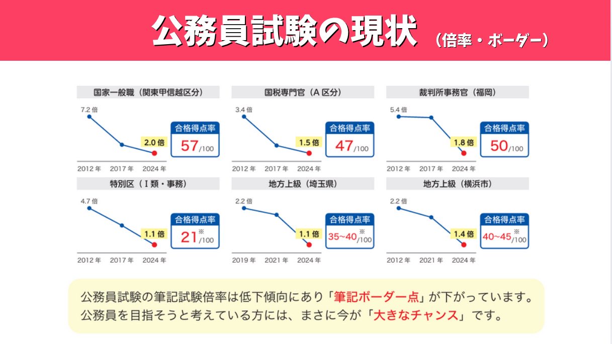 公務員試験の倍率は年々下がり、筆記のボーダーも低くなってきています‼